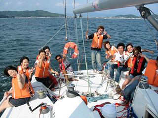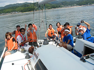 | 午前中から準備開始。結構沢山の機材を運びこんでセッティングしています。 | 体験クルーズに出発!天気は良かったけど、風が無い!! |