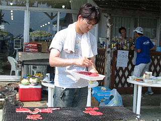 | 今年もお馴染みの三陸沖海鮮バーベキュー。大きなホタテ貝が次々に焼かれます。 | 黙々と肉を焼くお兄さんは非常に働き者で、皆が感心しておりました。お疲れ様でした! |