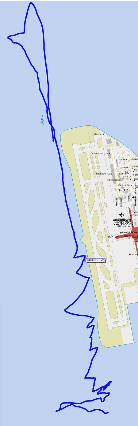 今年の伊勢湾マリンカップヨットレースは、セントレア(中部国際空港)で開催されました。艇長会議と前夜祭はセントレアのレストランで行われ、レースは空港島南端にある誘導灯の端をスタートして空港島北にあるマークを回って、空港島北端の誘導灯端でフィニッシュ、というコース。